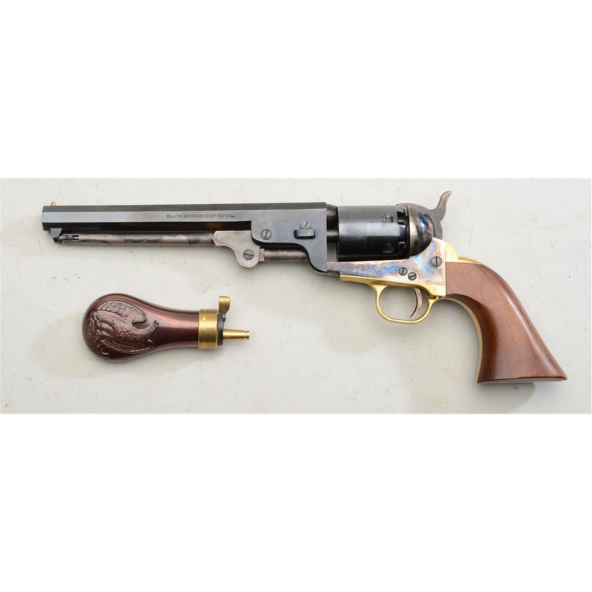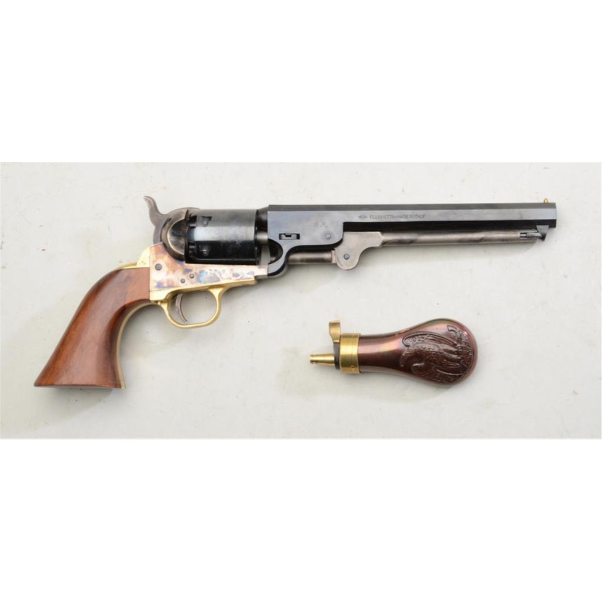 Italian-made copy of a Colt 1851 Navy percussion revolver, .36 cal., 7-1/2” octagon barrel, blue and case hardened finish, smooth wood grips, #462286. This gun is in excellent condition showing little use orhandling; accompanied by a reproduction brass spread eagle powder flask. Est.: $150-$300.