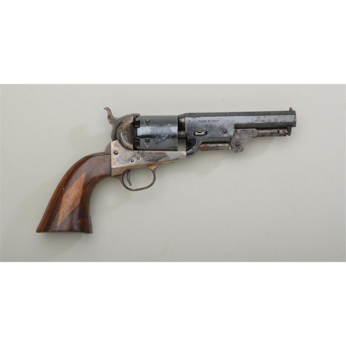 Italian-made copy of a Colt 1851 Navy percussion revolver for Navy Arms Co., .36 cal., 4-1/2” barrel, blue and case hardened finish, wood grips, #287. This gun is in overall very good condition showing themajority of original finish, some scattered spots of surface rust from storage, crisp action, very good wood grips with inset diamond lighter wood panels. Est.: $100-$200.