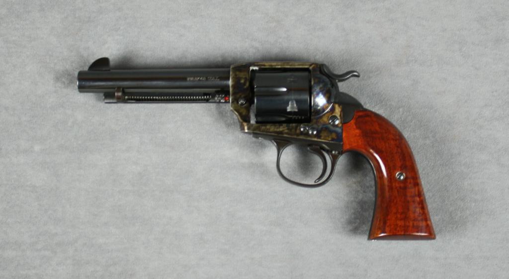 Italian-made copy of a Colt Bisley revolver, .45 Colt cal., 5-1/2” barrel, blue and case hardened finish, smooth wood grips, #SAB0052. This gun is in overall excellent condition showing little use. Est.: $250-$500.