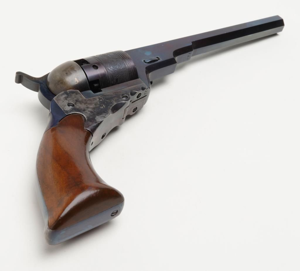 Italian-made copy of a Colt Texas Paterson percussion revolver for Replica Arms, Inc. of Marietta, Ohio, .36 cal., 7-1/2” octagon barrel, blue and case hardened finish, wood grips, #122 in overall fine condition showing little use orhandling; accompanied with reproduction bullet mold, cleaning rod and brass powder charger; also in two piece cardboard factory box. (Exempt-percussion reproduction). Est.: $275-$550.