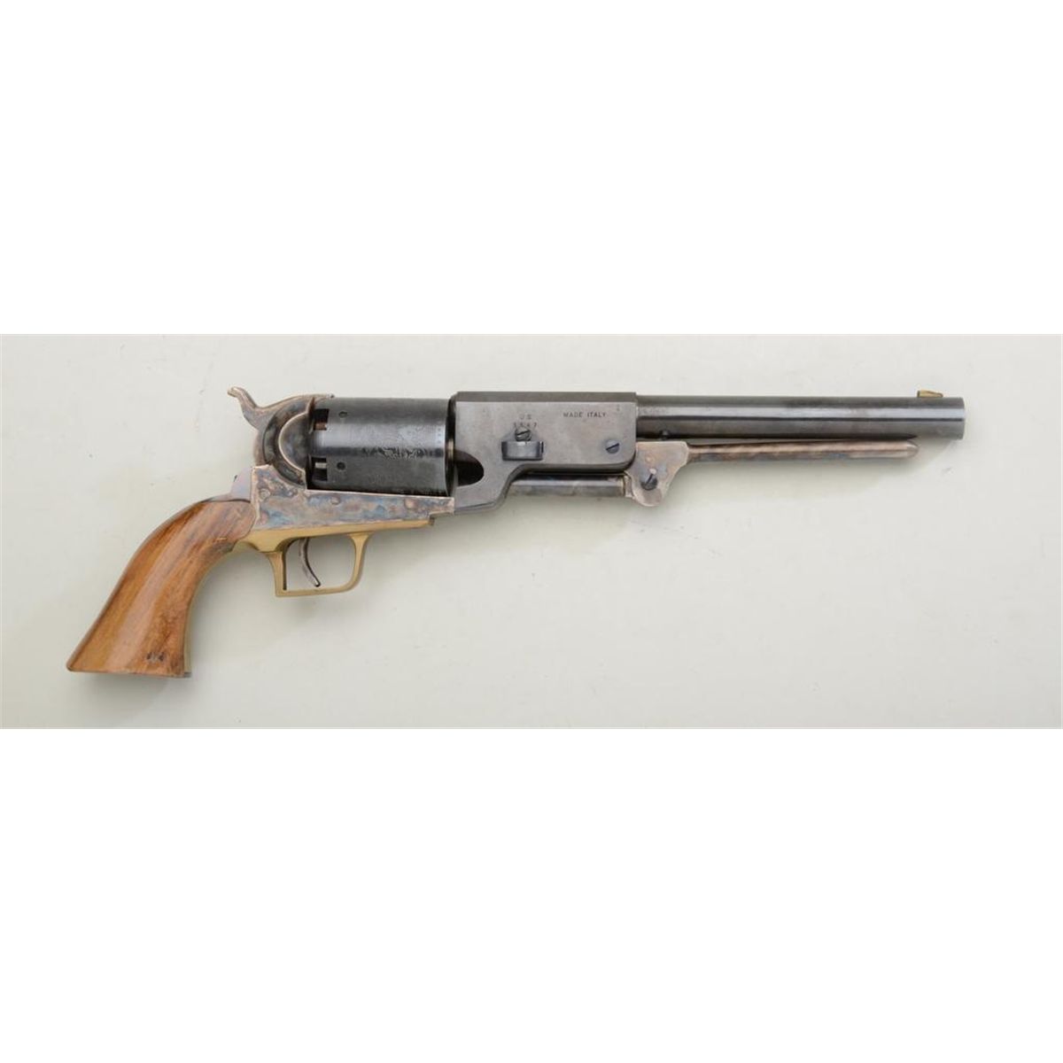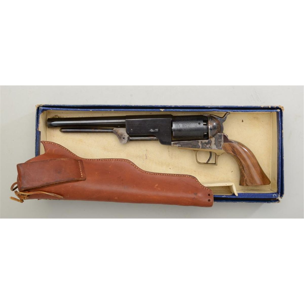 Italian-made copy of a Colt Walker percussion revolver, imported by Replica Arms Co., El Paso, Texas, .44 cal., 9” barrel, blue and case hardened finish, wood grips, #500. This gun is in overall fine condition showinglittle use and the majority of its original finish on metal surfaces, some light surface rust on the recoil shield from storage that should clean easily; very good grips with some scattered mars from storage; accompanied by two piece blue cardboard shipping box. Est.: $200-$400.