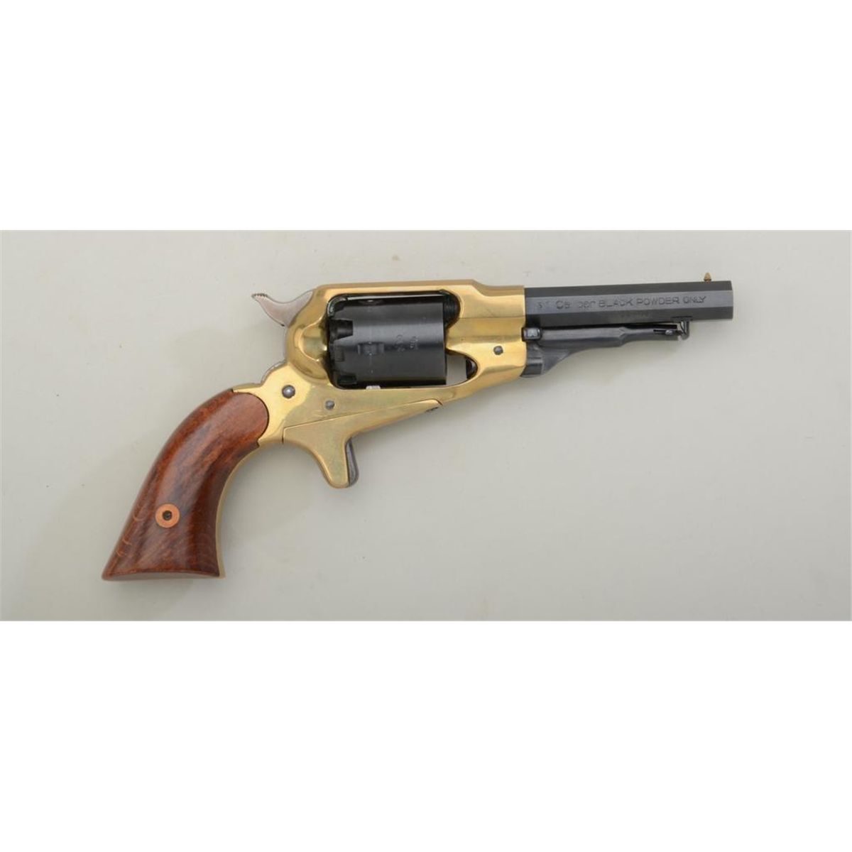 Italian-made copy of a Remington Pocket Police percussion spur trigger revolver, .31 caliber (black powder only), 3-1/2” octagon barrel, black finish to barrel assembly and cylinder, brass frame, wood grips, #034962.This gun is in overall like new condition showing little use or handling. Est.: $75-$150.