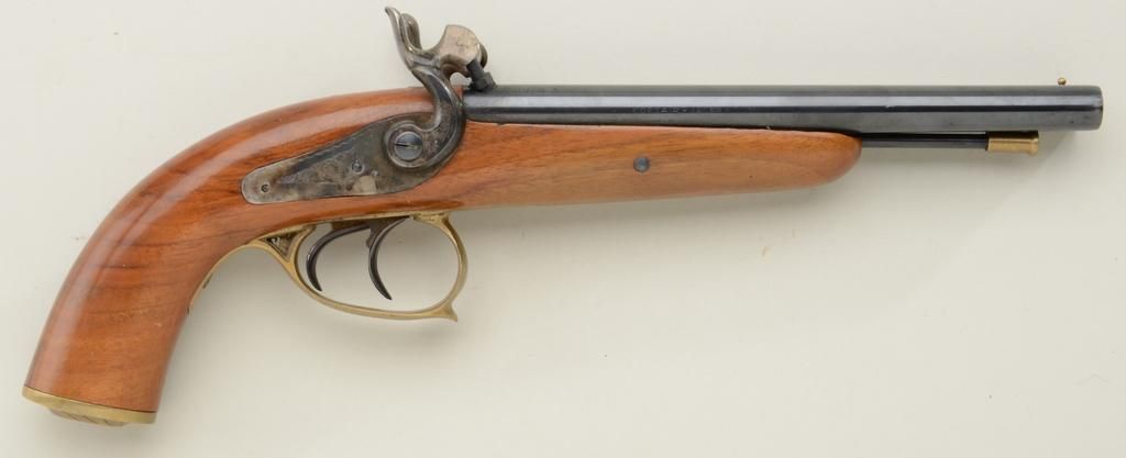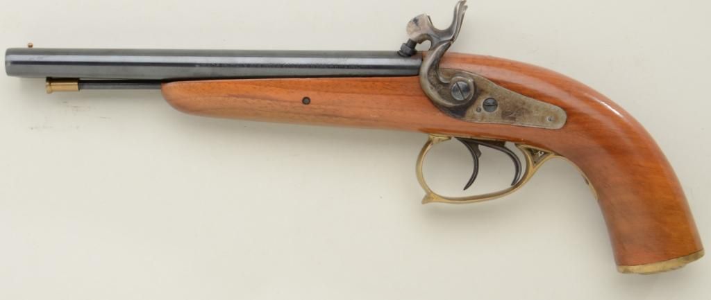 Italian-made copy of a double barrel percussion pistol by Intercontinental Arms Co.; .44 cal., 9” barrels, blue and case hardened finish, brass furniture, #6843. This gun is in overall fine to excellentcondition and made for use with black powder only. Est.: $90-$180.