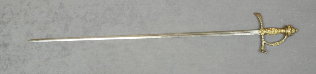 Italian-made copy of an old court sword with  etched blade and cast brass cross guard, grip  and pommel, approx. 41” overall.  Est.:   $50-$75.