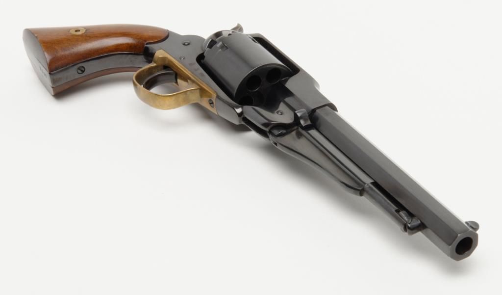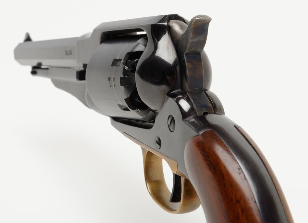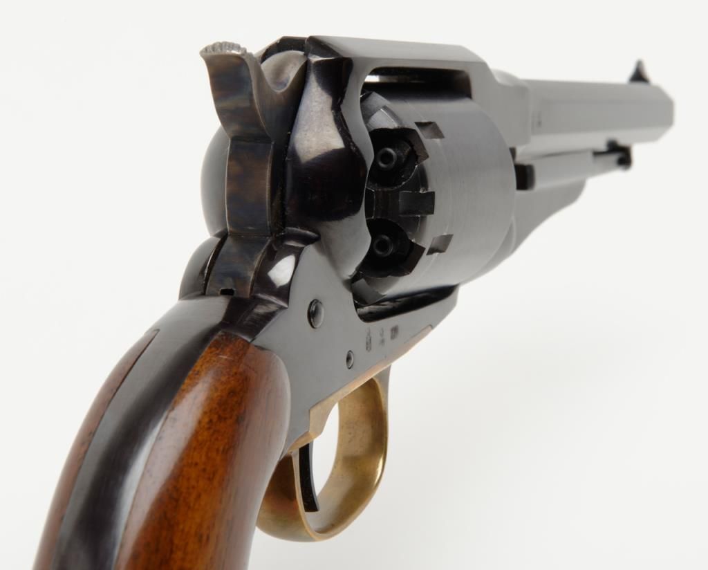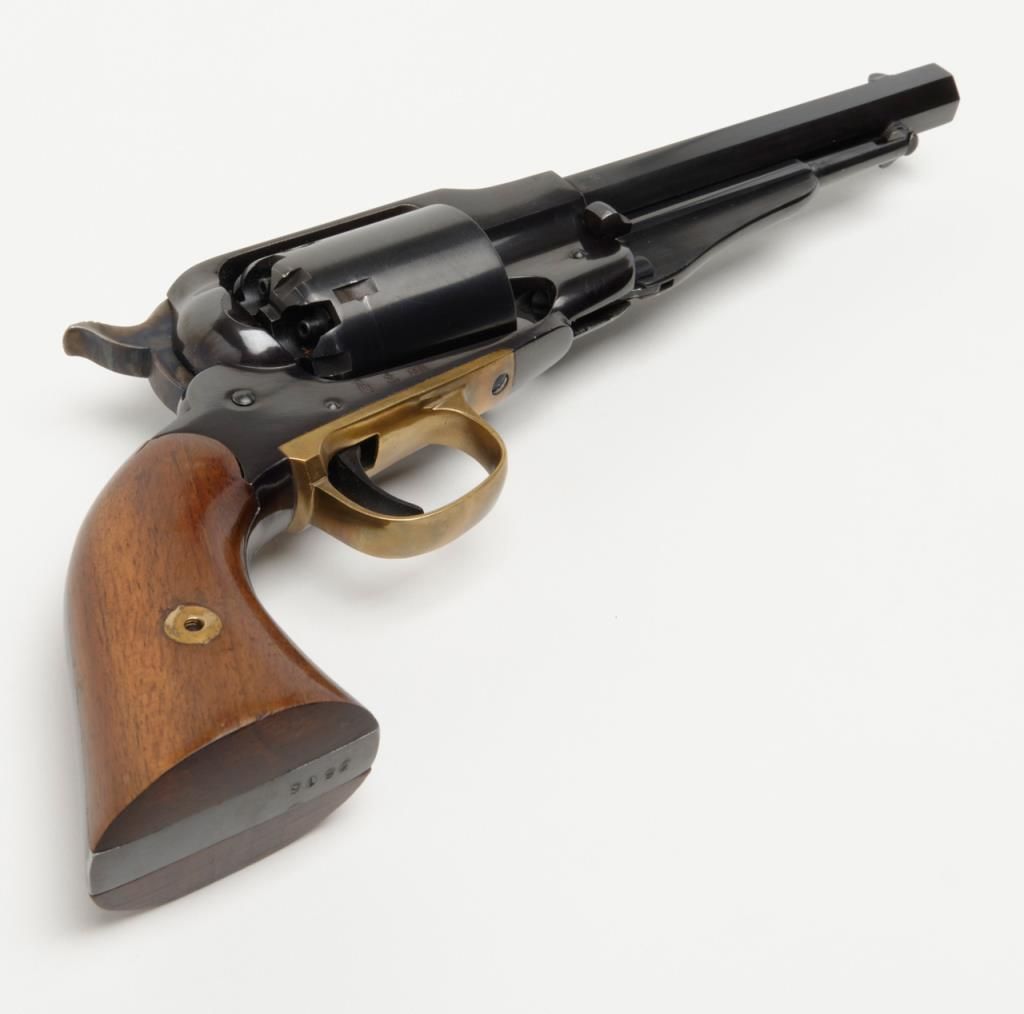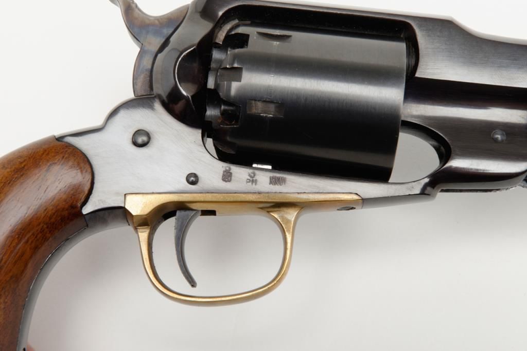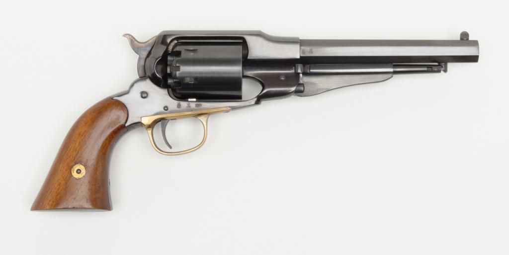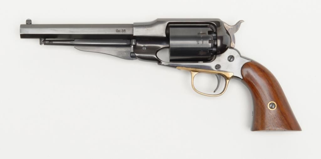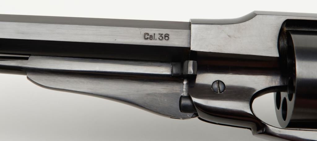Italian-made reproduction of a Remington Model 1858 percussion revolver for Navy Arms, .36 cal., 6-1/2” octagon barrel, blue finish, wood grips, #3616 in like new condition showing little handling or use; in factory cardboard box withinstructions. (Exempt-Percussion). Est.: $100-$200.