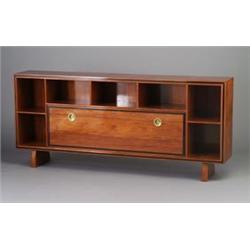 Italian mahogany sideboard attributed of PAULO BUFFO, c. 1950, with drop-front door inlaid with ebony, open cabinet with black lacquered interior and drop-front with recessed brass pulls. Excellent original condition. Unmarked. 36" x 82" x 14" $2,500 - 3,500