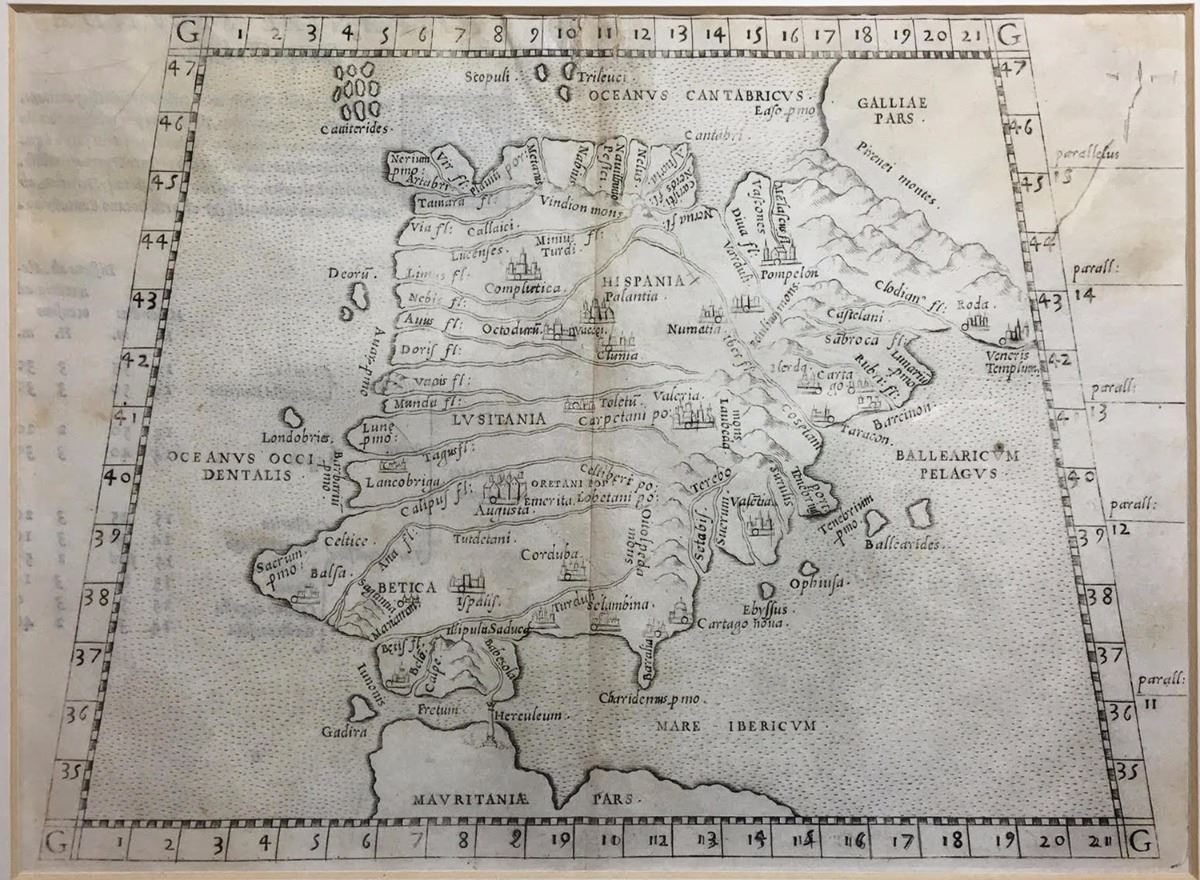 Italian map of Spain and Portugal, ca. 1550 (possibly by Giacomo Gastaldi, based on earlier map by Sebastien Munster?), matted and framed. 16" x 13-1/2" total (image size 10" x 7"). Characteristic "trapezoidal" style of the period showing scale in margins, labelled cities, rivers, mountains and islands, with original fold in center and minor ink-flaw at upper right but otherwise in great condition (not colored), also with photocopy of back of document (table of distances in Latin) pasted to back of frame, a sturdy and attractive piece for hanging.