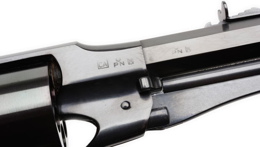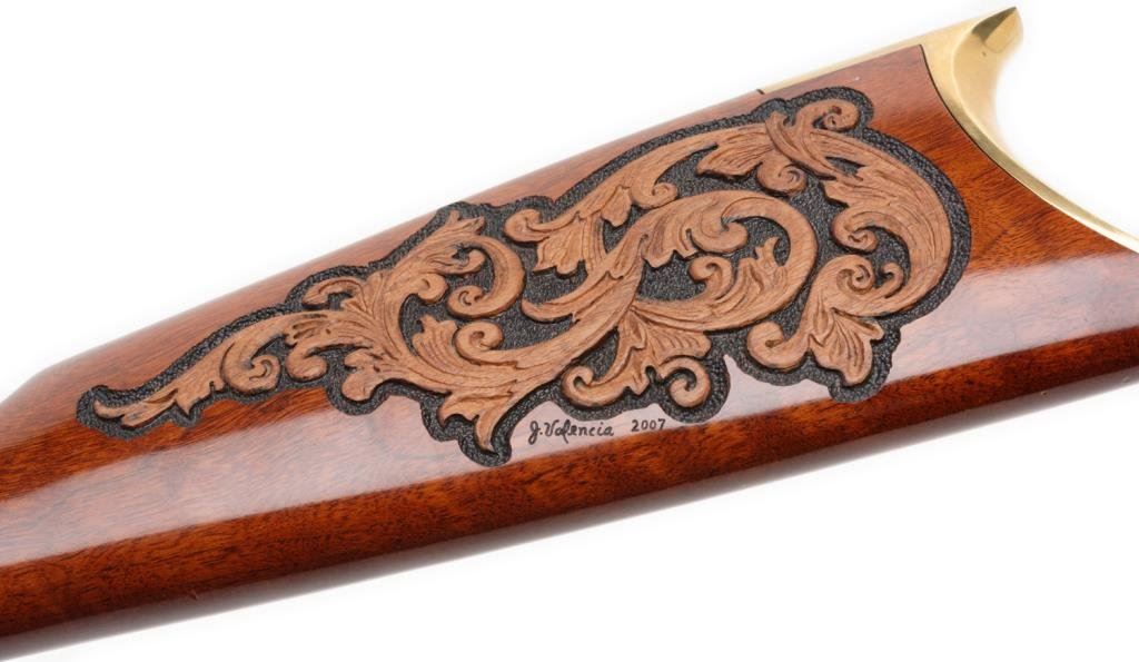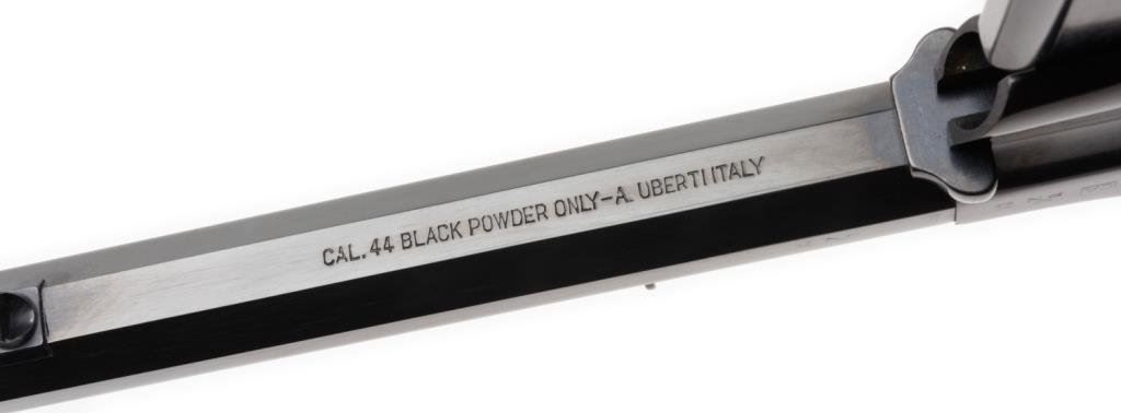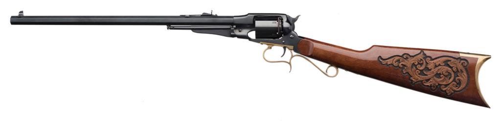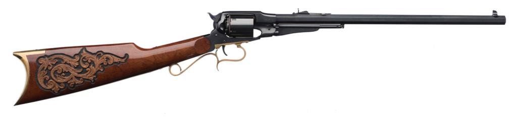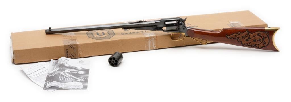 Italian modern copy of a Remington revolving carbine with extra cylinder, .44 Black powder only caliber, 18” octagon barrel, S/N A59288, blued finish, brass trigger guard, high relief raised carving on both sides of the butt stock, with factory cardboard box and manual. This gun is in like new condition as customized with beautiful finish. Consignor indicates action polished, tuned and fitted. Est.: $1,000-$2,000.