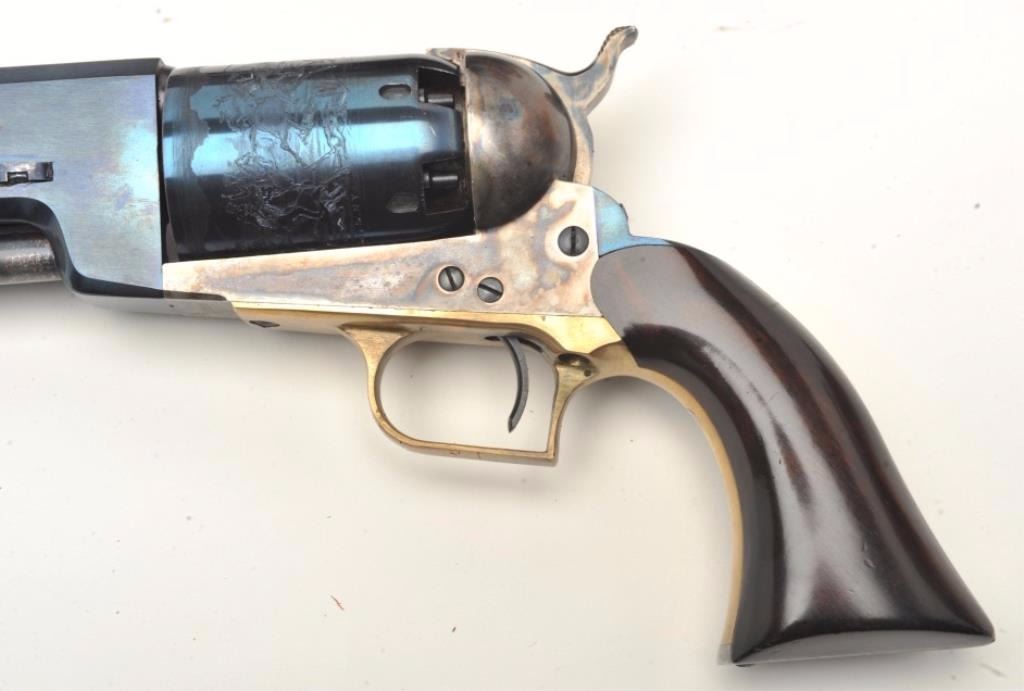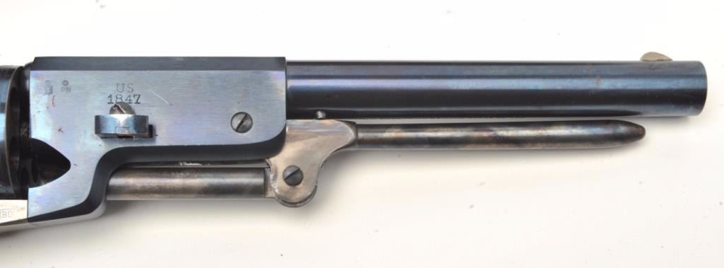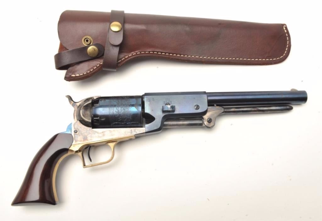 Italian reproduction of a Colt Walker percussion revolver, .44 caliber, blued and case hardened finish, wood grips, S/N 08323, in near new condition and accompanied by a brown leather holster. (Percussion).Est.: $200-$400.