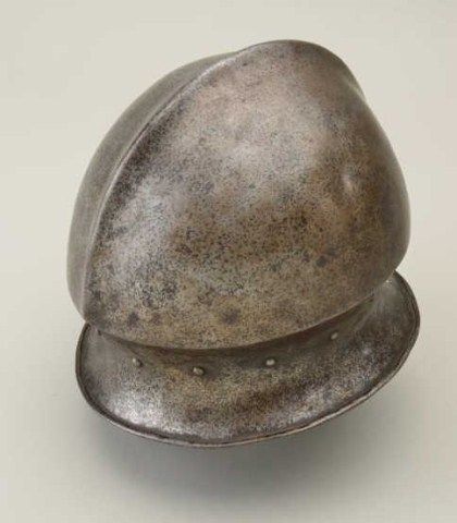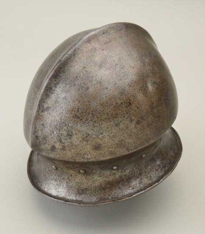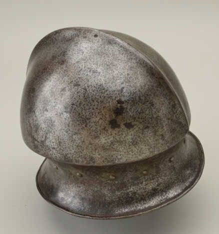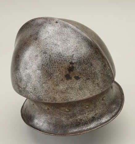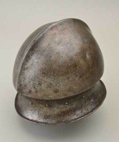 Italian style salud with phallic style top circa about 1530-1580. The helmet is forged in one piece and shows very good metal work with excellent shaping and molding. Made to be worn with a leather padded cap as not toslip down over eyes. The condition is very good for its age and is an original period helmet not a Victorian helmet or more modern copy. Est.; $3,000-$6,000