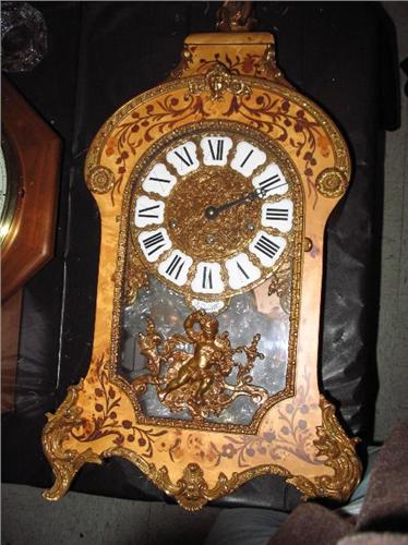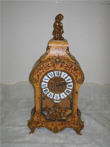 The clock is yellow with red detail and gold colored adornments. The booklet inside has the name Artem. The clock is approximately 14.5" wide and 30" tall.