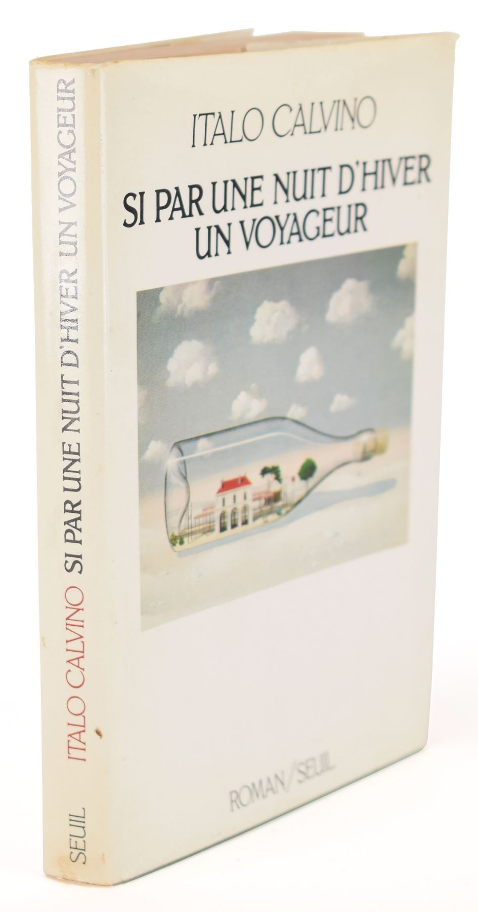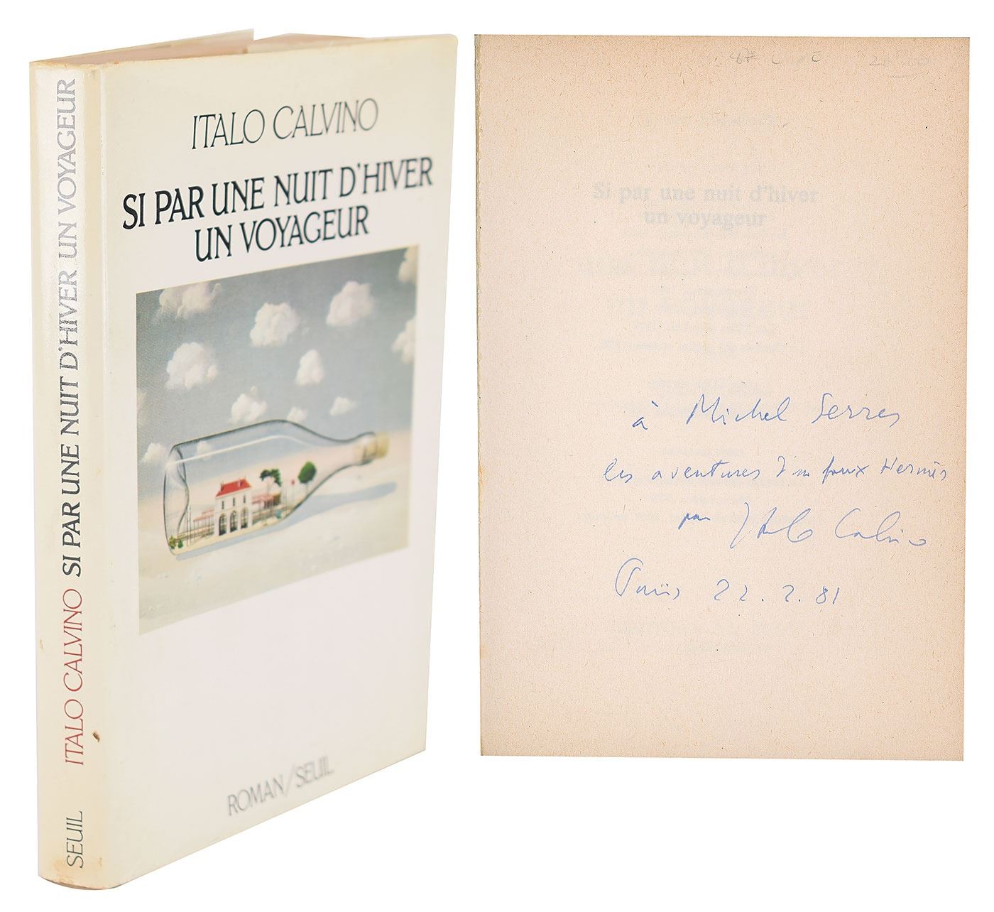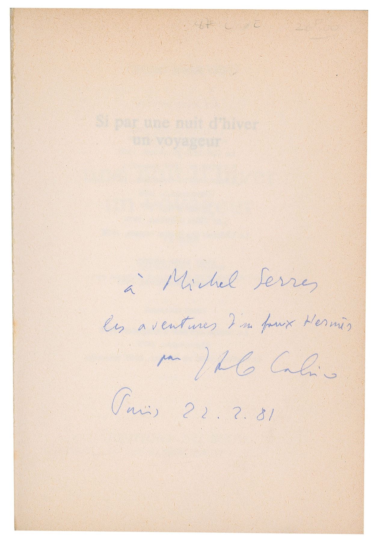 Signed French-language book: Si par une nuit d'hiver un voyageur [If on a winter's night a traveler]. Paris: Editions du Seuil, 1981. Softcover with dust jacket, 5.5 x 8, 277 pages. Signed and inscribed in French in blue ink to philosopher Michel Serres, "Italo Calvino, Paris 22. 2. 81." In fine condition.