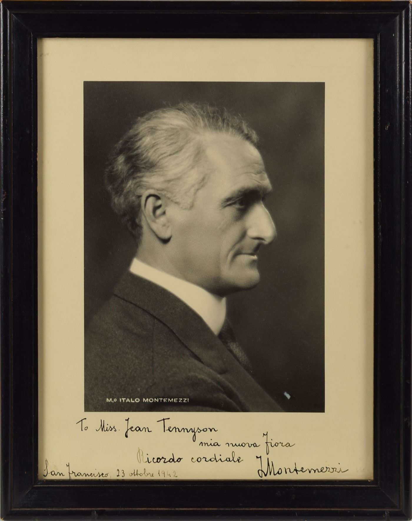 Italian composer (1875–1952) best known for his opera L'amore dei tre re [The Love of the Three Kings]. Handsome matte-finish 9 x 11.75 portrait, boldly signed and inscribed in the lower border in fountain pen, "To Miss Jean Tennyson, mia nuova fiora, ricordo cordiale, I. Montemezzi, San Francisco 23 Octobre 1942.” Framed to an overall size of 11 x 13.75. In fine condition. Jean Tennyson was an operatic soprano and noted patron of the arts.