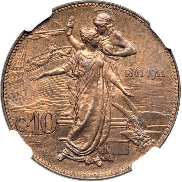Italy. 10 Centesimi, 1911-R. KM-51; Pagani-863. Vittorio Emanuele III. 50th Anniversary of the Kingdom. NGC graded MS-65 Red & Brown.