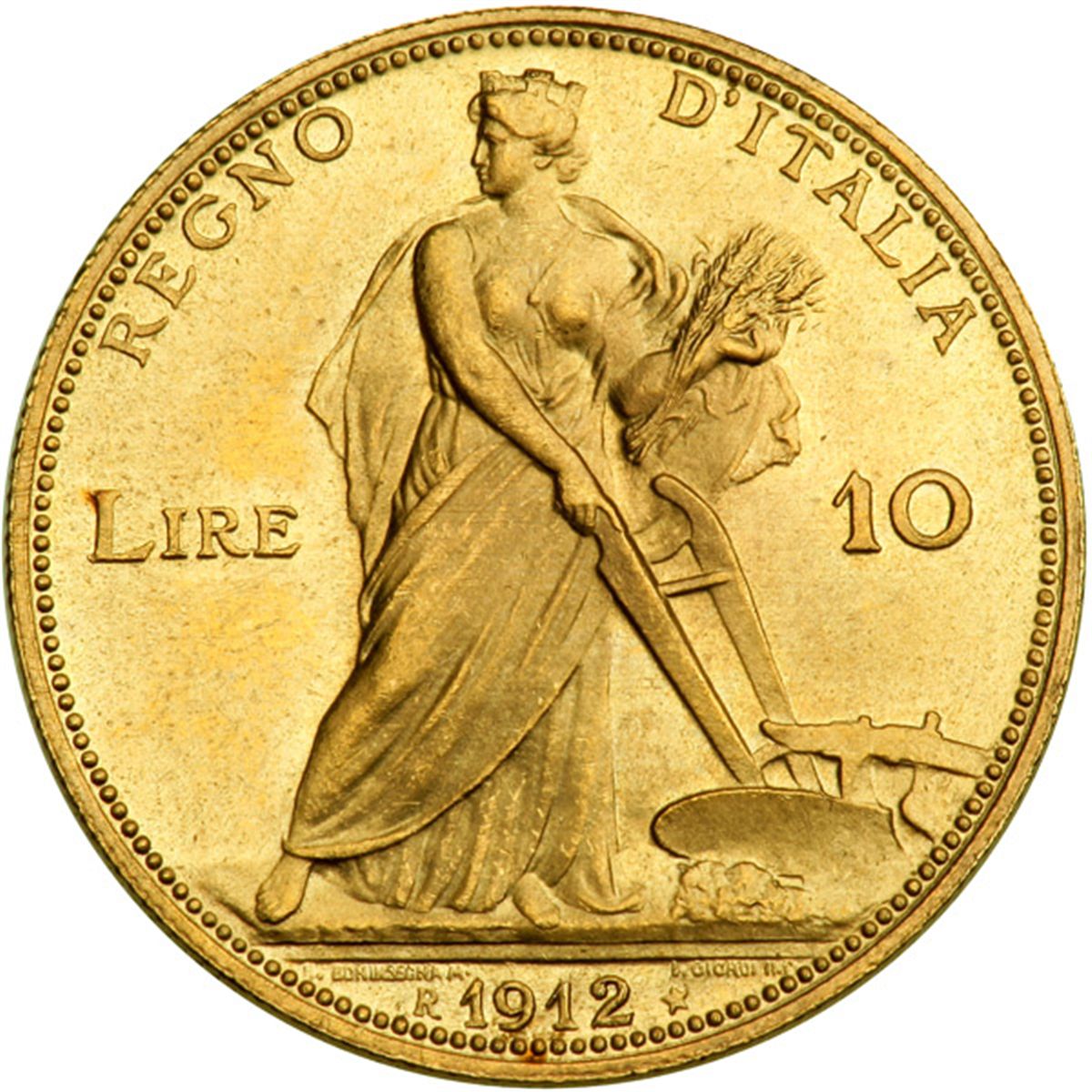 Italy. 10 Lire, 1912-R. Fr-29; Pagani-688 (Rarity-3); KM-47. Vittorio Emanuele III, 1900-1946. Uniformed bust left. Reverse: Female standing on prow. Choice example with frosty original mint luster. Very Rare. NGC graded MS-64.