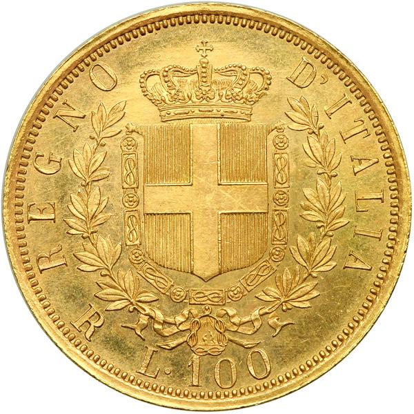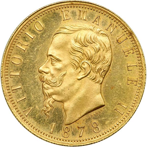 Italy. 100 Lire, 1878-R. Fr-9; KM-19.2; Pagani-453 (Rarity-3). Vittorio Emanuele II. Mintage of only 294 pieces struck. Head left. Reverse: Crowned arms within wreath. Reflective fields with flashy mint luster. Extremely Rare. NGC graded MS-64.