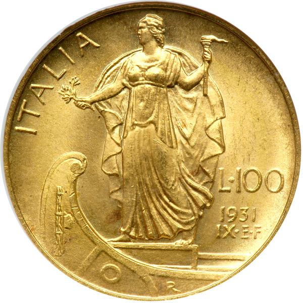 Italy. 100 Lire, 1931-R. Fr-33; KM-72. Year IX. Vittorio Emanuele III. Head left. Reverse: Italia on prow of ship. NGC graded MS-63.