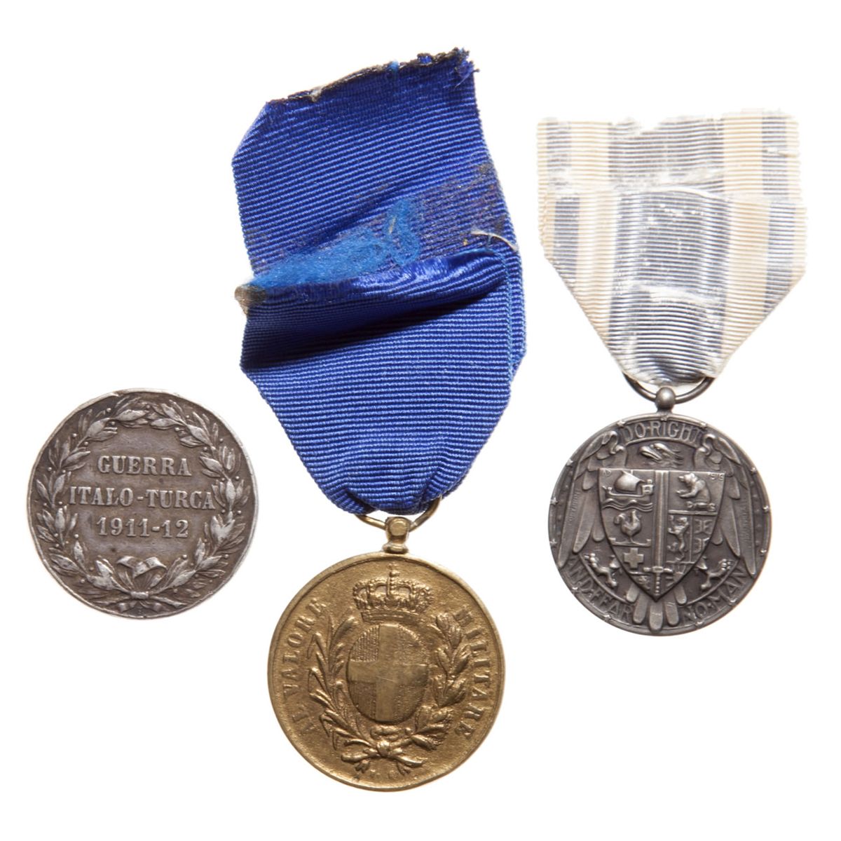 Italo-Turkish war medal in silver; with WWI medal of valour (sand-cast) French 1923 disaster medal in silver. Very Fine. Lot of three (3) pieces.