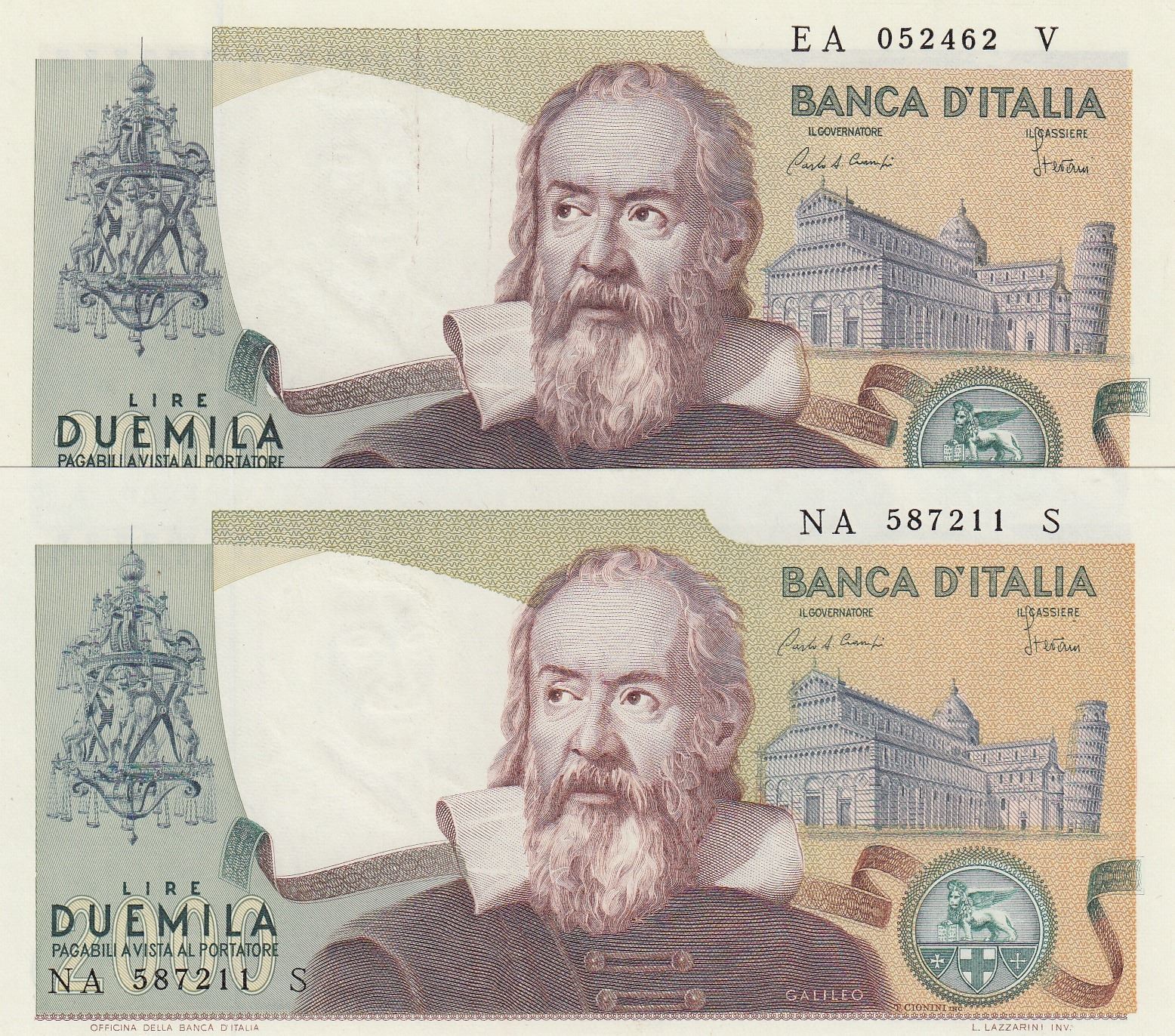 Italy, 2.000 Lie, 1983, UNC, p103c, (Total 2 banknetes)br/Galileo portrait, serial numbers: EA 052462V and NA 587211S