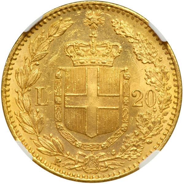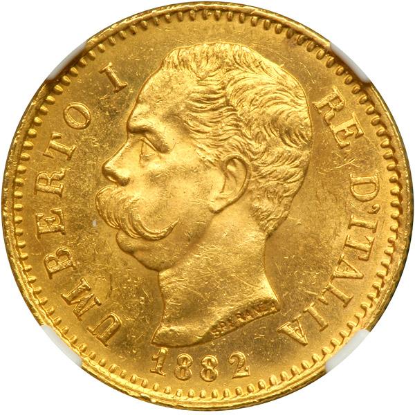 Italy. 20 Lire, 1882-R. Fr-21; KM-21. Weight 0.1867 ounce. Umberto I, 1878-1900. NGC graded MS-62.