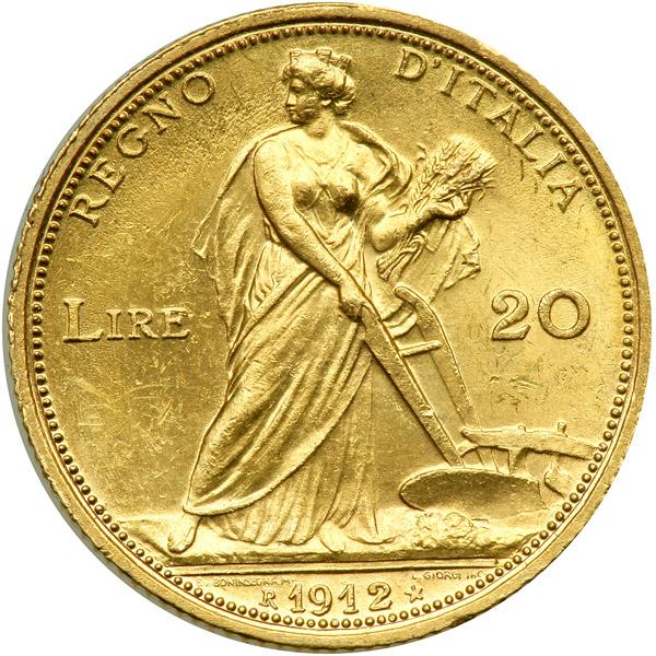 Italy. 20 Lire, 1912. Fr-28; KM-48; Pagani-667. Vittorio Emanuele III. Head left. Reverse: Agricultural scene. NGC graded MS-62.