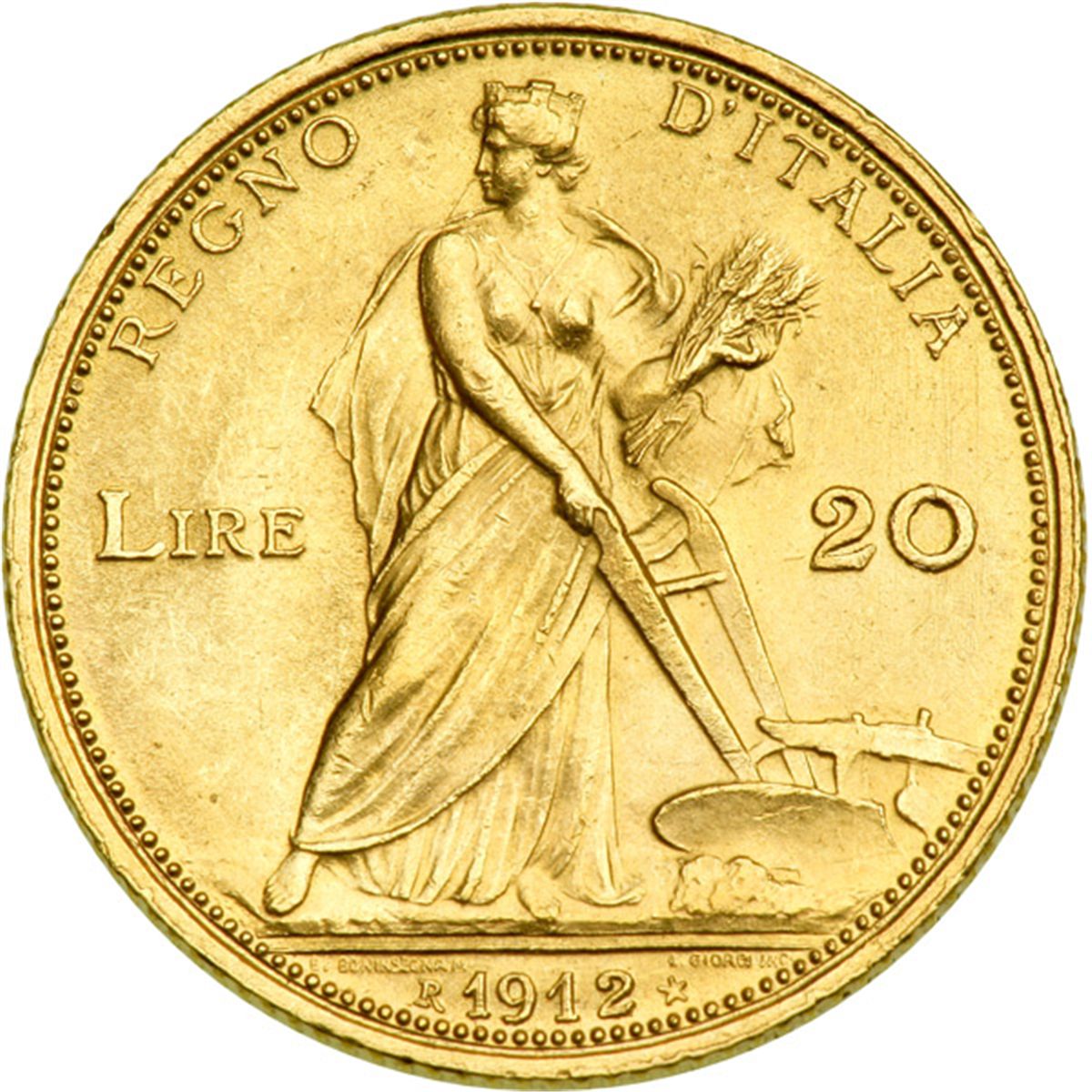 Italy. 20 Lire, 1912-R. Fr-28; Pagani-667; KM-48. Vittorio Emanuele III, 1900-1946. Uniformed bust left. Reverse: Female standing on prow. NGC graded MS-62.
