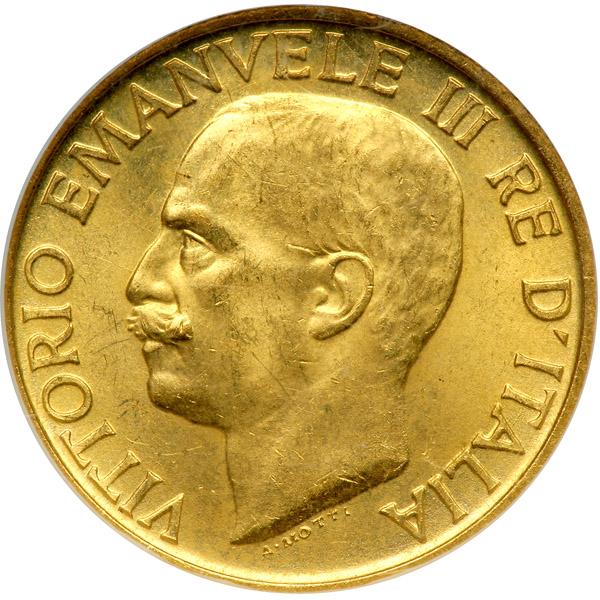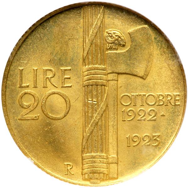 Italy. 20 Lire, 1923-R. Fr-31; KM-64. Vittorio Emanuele III, 1900-1946. Head left. Reverse: Fasces. On the first year of the Fascist march on Rome. One year type. NGC graded MS-62.
