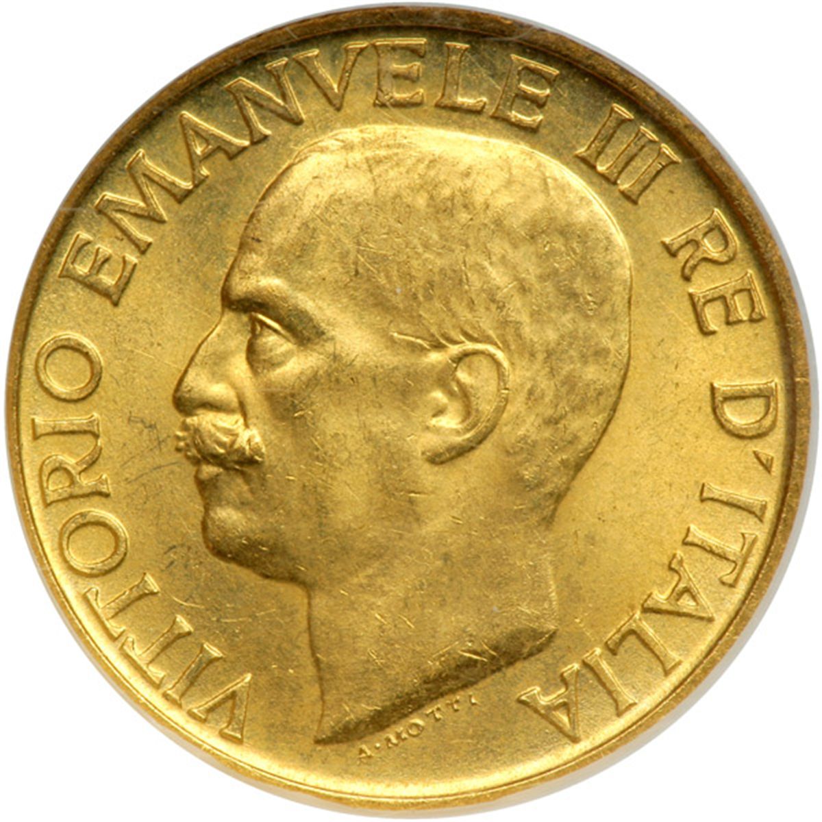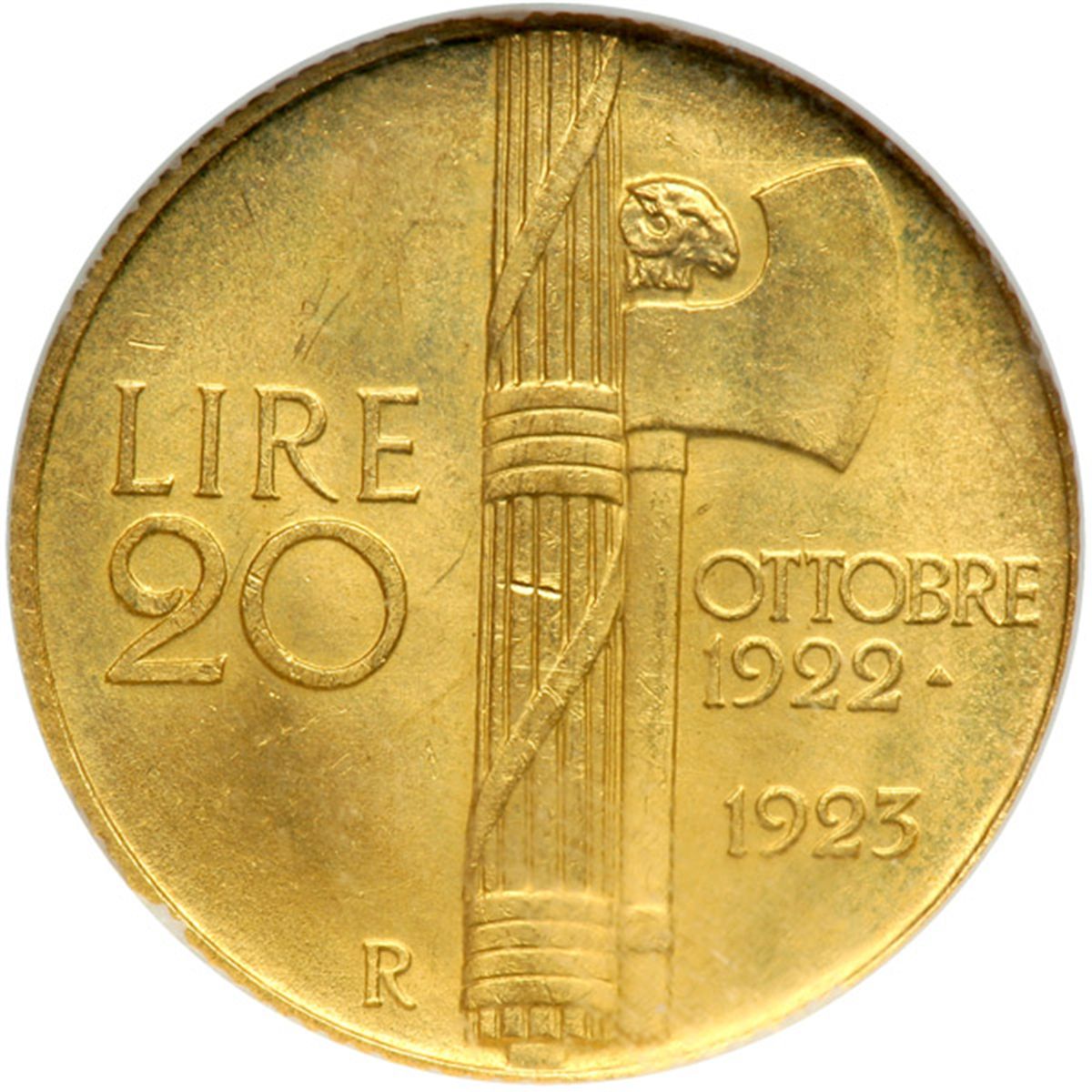 Italy. 20 Lire, 1923-R. Fr-31; KM-64. Vittorio Emanuele III, 1900-1946. Head left. Reverse: Fasces. On the first year of the Fascist march on Rome. One year type. NGC graded MS-62.