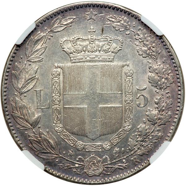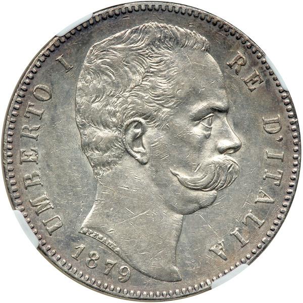 Italy. 5 Lire, 1879-R. Dav-141; KM-20; Pagani-590. Umberto I. Head right. Reverse: Crowned arms. NGC graded AU-55.