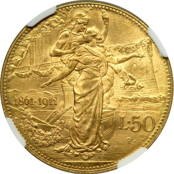 Italy. 50 Lire, 1911-R. Fr-25; Pagani-656; KM-54. Vittorio Emanuele III. 50th Anniversary of the Kingdom. NGC graded MS-63.