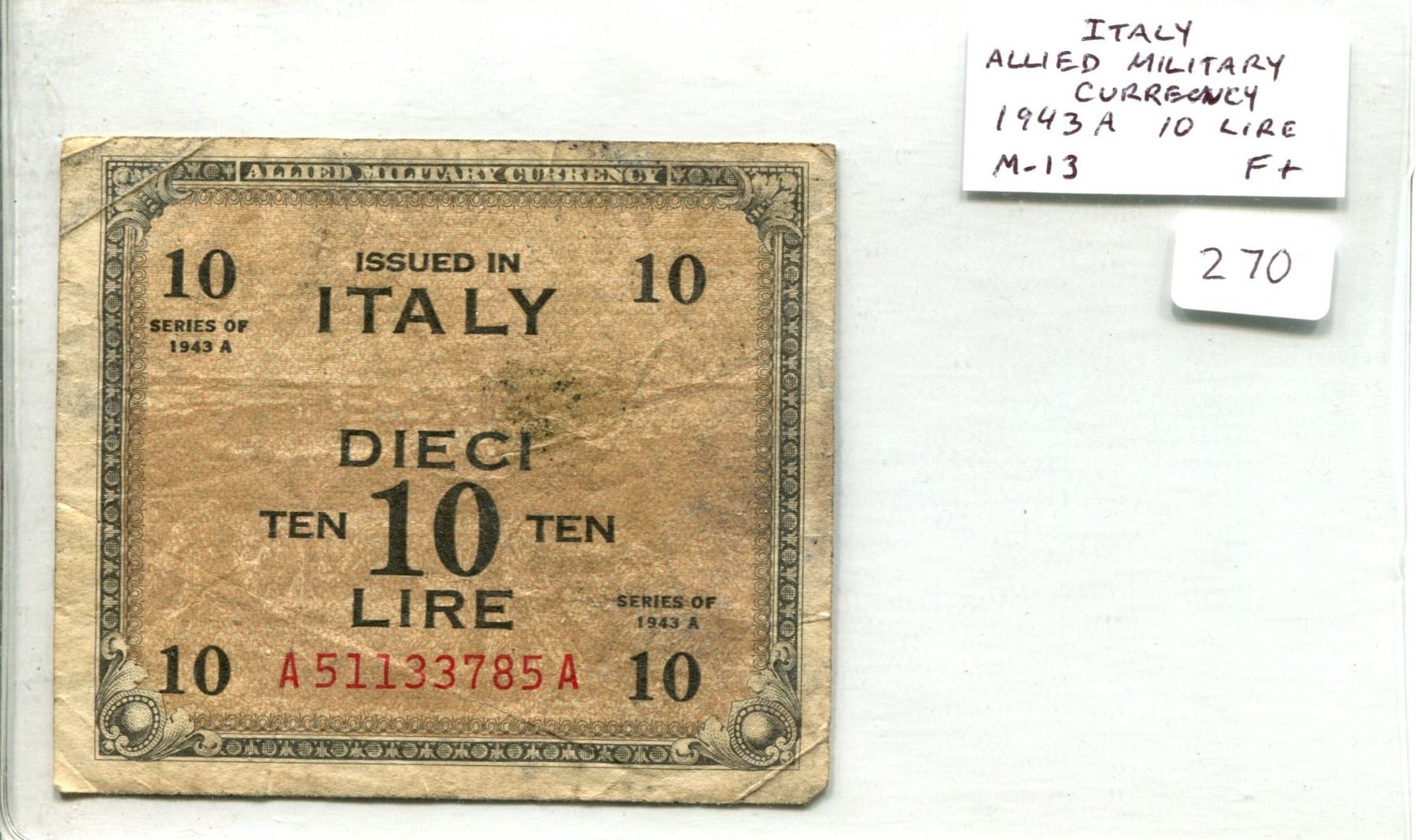 Italy. Allied Military Currency. 1943A 10 Lire. Issued by the Allies and used in Italian areas liberated from Italian and German Fascist forces. MS-13. F+.