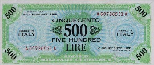 Italy - Allied Military Currency - Occupazione militare alleata Banconota da 500 Lire 1943 Emissione Bilingue - Di ottima qualità -