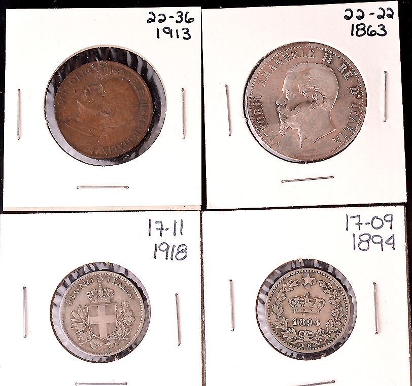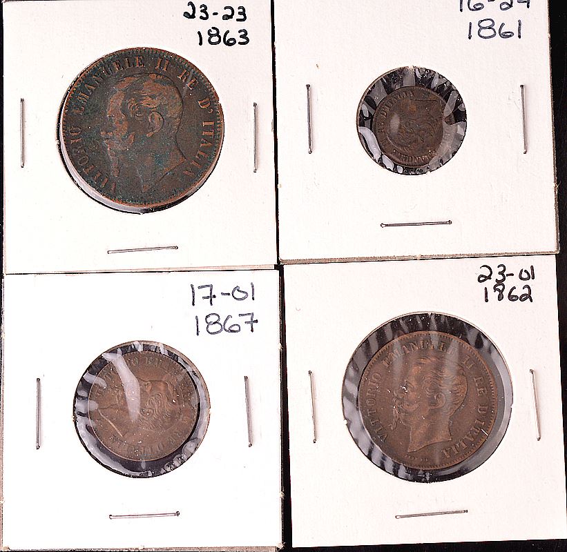 Italy, Accumulation of Copper & Base Metal coins, Centesimo, 1861-1914, (17); 2 Centesimi, 1861-1903, (15); 5 Centesimi, 1861-1867, (20); 1913-1929, (10); 10 Centesimi, 1862-1894, (25); 1928-1939, (6); other misc, 1894 to 1980's, (69); Damaged coins, mostly 1860's, (50); other than damaged coins, grades range from Good to VF, most VG to Fine. Total of 212 pcs.