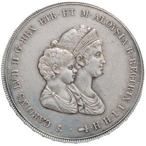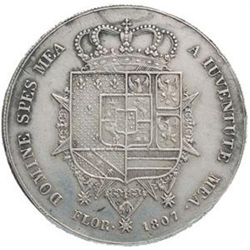 Monete e Medaglie di Zecche Italiane. Firenze. Carlo Ludovico di Borbone (1803-1807) con la reggenza della madre Maria Luisa. Dena 1807. Pag.27. AG. BB+/qSPL.