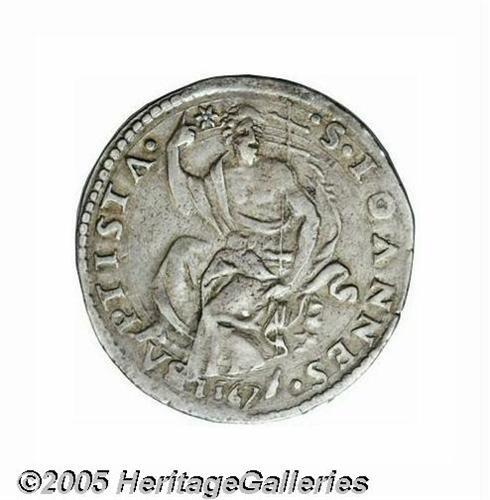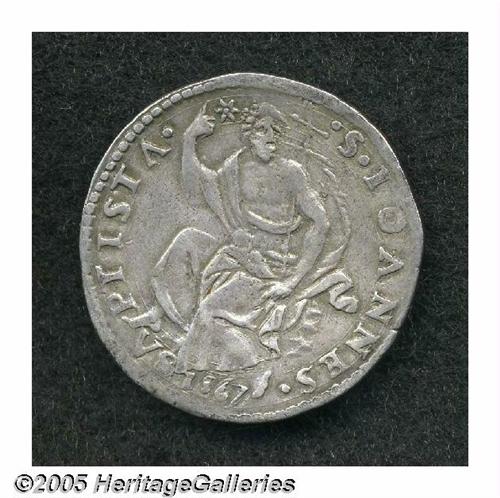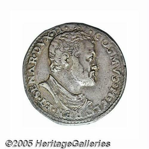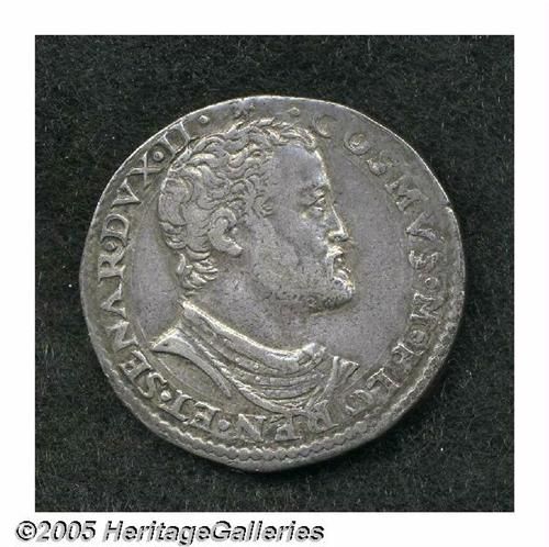 <B>Florence. Cosimo I Medici Testone 1567, </B></I>Obverse: Bearded bust right, Reverse: John the Baptist seated with long cross. Superbly toned VF, tiny flan flaws as made, very handsome example of this classic rarity.