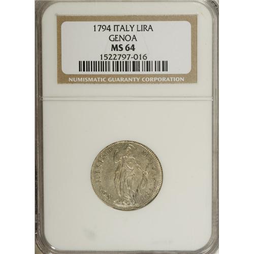<B>Genoa. Biennial Doges 1 Lira 1794,</B></I> KM211a, CNI 8, MS64 NGC. Lustrous and bright with light contact marks. Very scarce in this condition. An XF example brought $600 in the 2005 September UBS sale.<BR><BR><b>Shipping:</b> Coins & Currency (<a target="_blank" href="http://www.heritageauctions.com/common/shipping.php">view shipping information</a>)