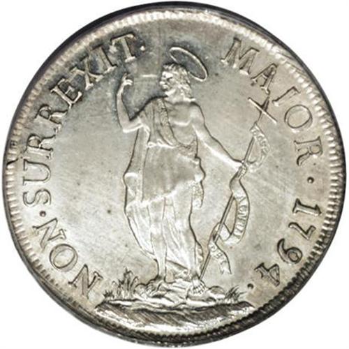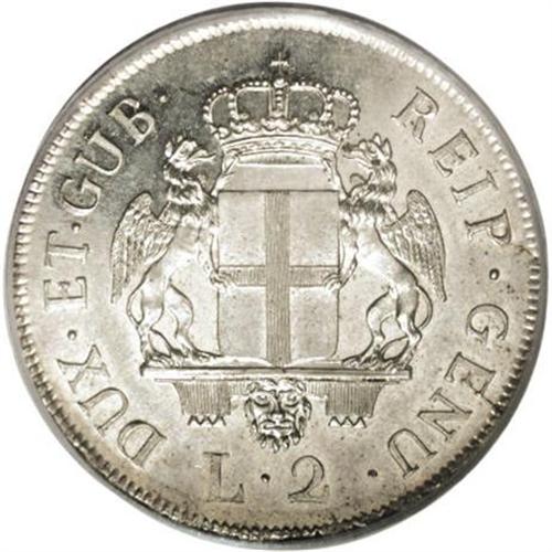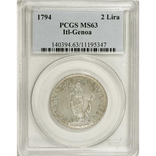 <B>Genoa. Biennial Doges 2 Lira 1794,</B></I> KM244a, CNI 7, MS63 PCGS. Fully brilliant and lustrous with minor marks. Very scarce in this condition.<BR><BR><b>Shipping:</b> Coins & Currency (<a target="_blank" href="http://www.heritageauctions.com/common/shipping.php">view shipping information</a>)