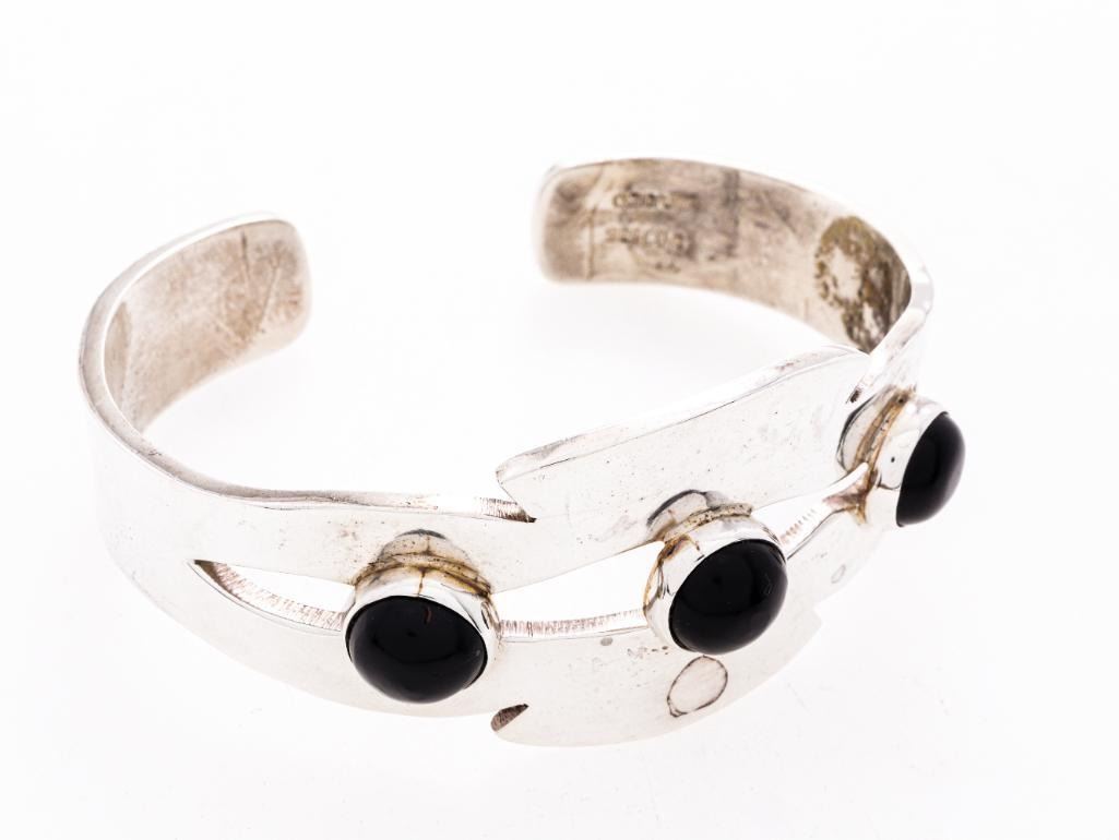 Italy - Hand Made Bangle Bracelet w/ 3 Bezel Set Onyx Stones -Over 40 Grams