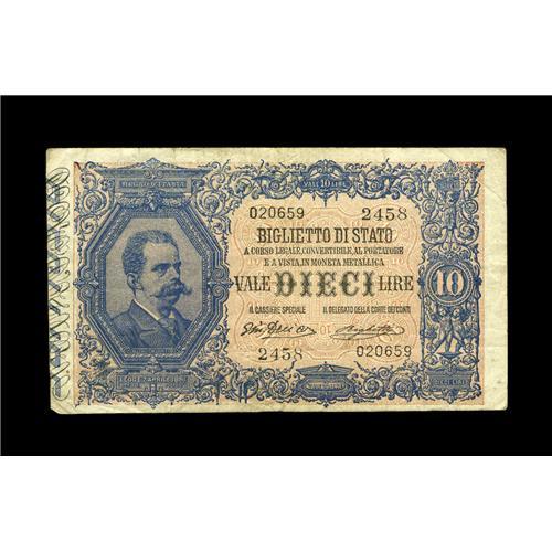 <B>Italy</B></I> Inverted Back 10 Lire 1888-1925 Pick 20c<BR>The back is inverted on this Italian note that saw some circulation. <B>Very Fine.</B></I>