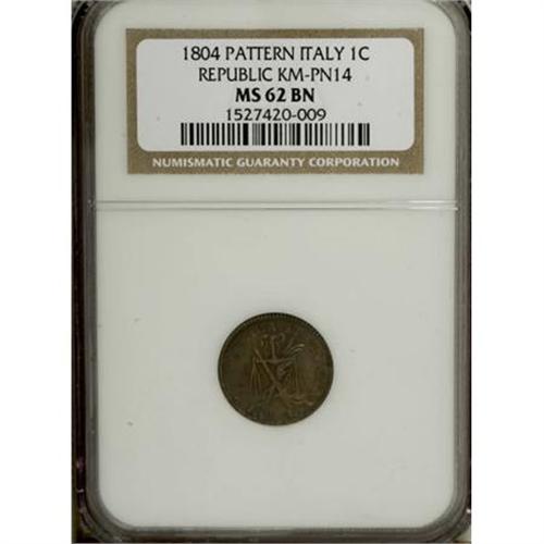 <B>Italian Republic. Pattern 1 Centesimo 1804-M,</B></I> KM-Pn14, MS62 BN NGC, a curious little piece featuring a scales of justice braced upon a crossed sword and palm frond, symbols of the Cisalpine Republic (founded by Napoleon Bonaparte in 1802, it soon evaporated along with Napoleon's dreams of world conquest).<BR><BR><b>Shipping:</b> Coins & Currency (<a target="_blank" href="http://www.heritageauctions.com/common/shipping.php">view shipping information</a>)