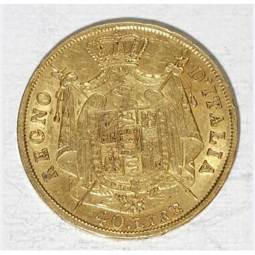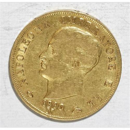<B>Kingdom of Napoleon. Gold 40 Lira 1810/09-M,</B></I> KM-12, Choice VF, some old abrasions but the deep gold color more than excuses those. Scarce.<BR><BR><b>Shipping:</b> Coins & Currency (<a target="_blank" href="http://www.heritageauctions.com/common/shipping.php">view shipping information</a>)