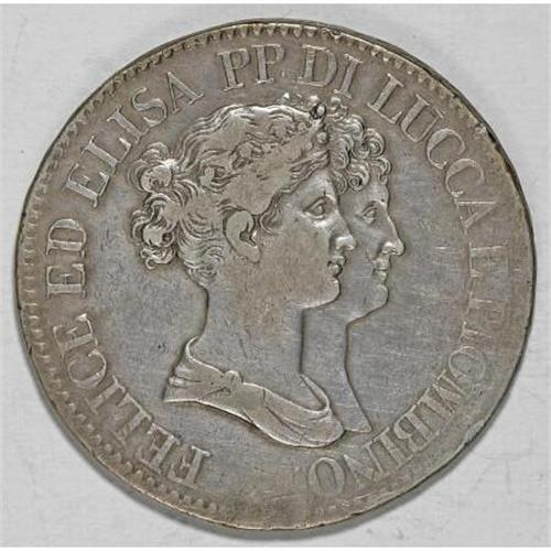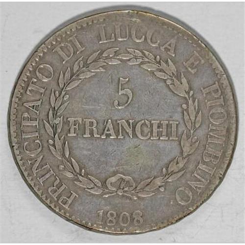 <B>Lucca. Felix & Elisa 5 Franchi 1808/7,</B></I> KM24.3, nice F-VF.<BR><BR><b>Shipping:</b> Coins & Currency (<a target="_blank" href="http://www.heritageauctions.com/common/shipping.php">view shipping information</a>)