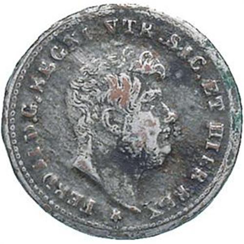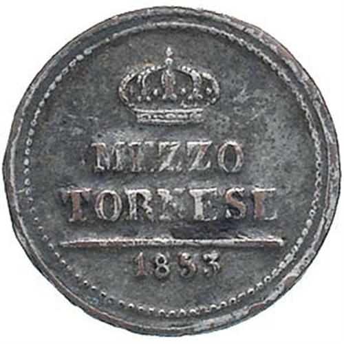 Monete e Medaglie di Zecche Italiane. Napoli. Ferdinando II (1830-1859). 1/2 tornese 1853. P.R. 476c var. RR. AE argentato. BB. Queste monete venivano a volte argentate per confonderle con i 5 grana. Interessante 'contraffazione' d'epoca.