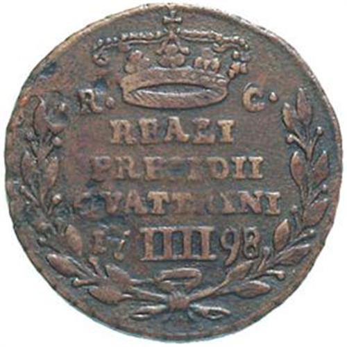 Monete e Medaglie di Zecche Italiane. Napoli. Ferdinando IV (1759-1816). 4 quattrini 1798. Reali Presidi di Toscana. P.R. 3. RR. AE. Insolita conservazione. BB+.