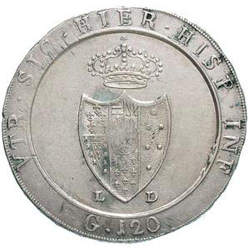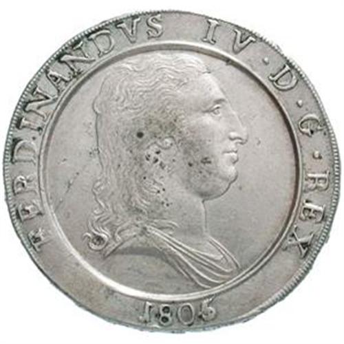 Monete e Medaglie di Zecche Italiane. Napoli. Ferdinando IV (1759-1816). Piastra 1805 capelli lisci. P.R.11. R. AG. qSPL.