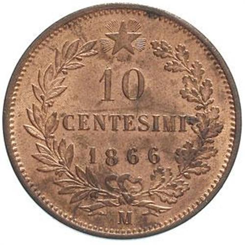 Casa Savoia - Regno di Sardegna - Regno di Italia. Regno di Italia. Vittorio Emanuele II (1861-1878). 10 centesimi 1866 M. Pag.541. AE. FDC.
