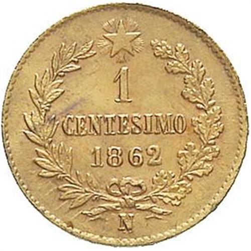 Casa Savoia - Regno di Sardegna - Regno di Italia. Regno di Italia. Vittorio Emanuele II (1861-1878). Centesimo 1862 N. Pag.564 var. RR. AE dorato. Esemplare ribattuto su centesimo precedente. Doratura d'epoca. Manca nei testi consultati sia per la doratura che per la ribattitura. qFDC.