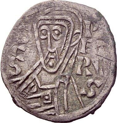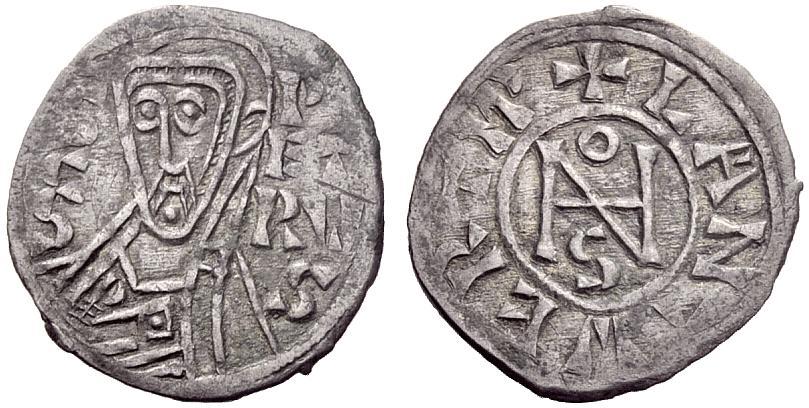 Medieval European Coinage. Italy. Roma. Giovanni IX, 898-900 with Lamberto, 898 and later to 900. Denaro, AR 1.38 g. S / C / S – P / ET / RV / S Bust of St. Peter facing. Rev. + LANTWERT MP around IOHANS in monogram. CNI 1. Muntoni 1. MEC 1, 1063. Berman 52. Old cabinet tone and about extremely fine. Ex M&M Germany sale 8, 2001, 559.
