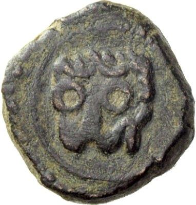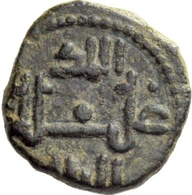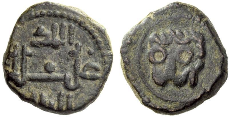 Medieval European Coinage. Italy. Sicilia. Guglielmo II, 1166-1189. Reduced follaro, Messina, Æ 1.80 g. Arabic legend on three lines. Rev. Lion mask. Spahr 118. MIN 371. MEC 14, 432. Good very fine. Ex Vecchi sale 15, 1999, 1965.