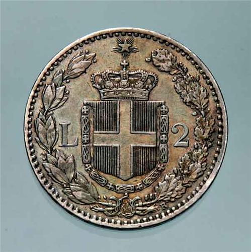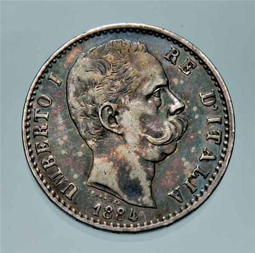 Italy - Umberto I - 2 L. 1884 - Ag - 2 Lire 1884 Zecca: Roma - Diritto: effigie del Re a destra - Rovescio: stemma di Casa Savoia coronato e circondato dal Collare dell'Annunziata entro due rami di alloro e di quercia intrecciati alla base - Patina di medagliere